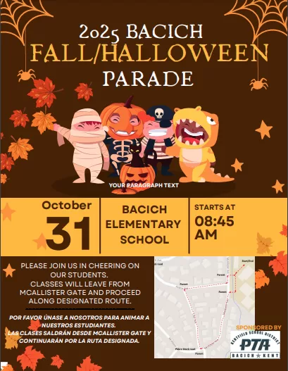 KSPTA is excited to host the Annual Bacich Halloween/Fall Parade on Friday, October 31! The Parade will begin at 8:45am with the students departing from the Kindergarten...
